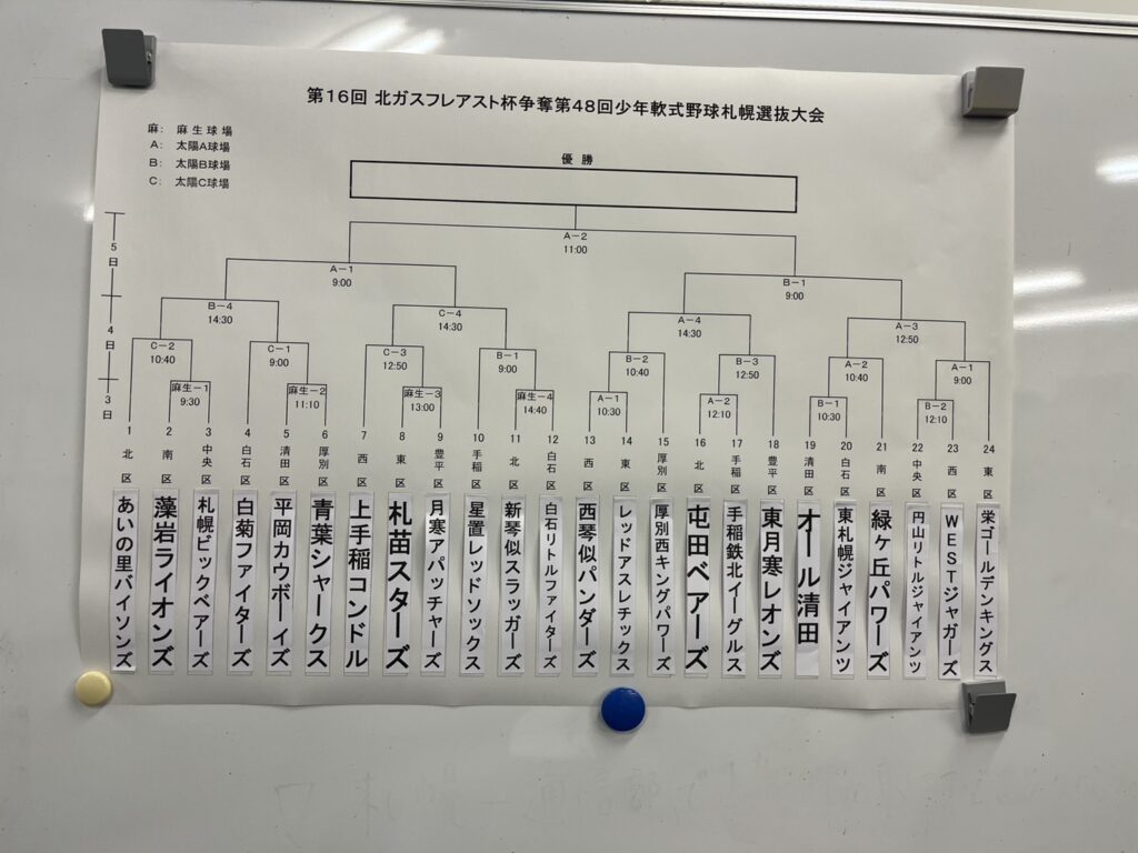 5月3日~5日、麻生球場・太陽ABCにて札幌市内10区の代表24チームによるトーナメント戦が開催されます。4月7日㈫毎日新聞社において監督会議が開催され各区代表24チームの監督・主将が参加し抽選会が行われてトーナメント表が確定致しました!